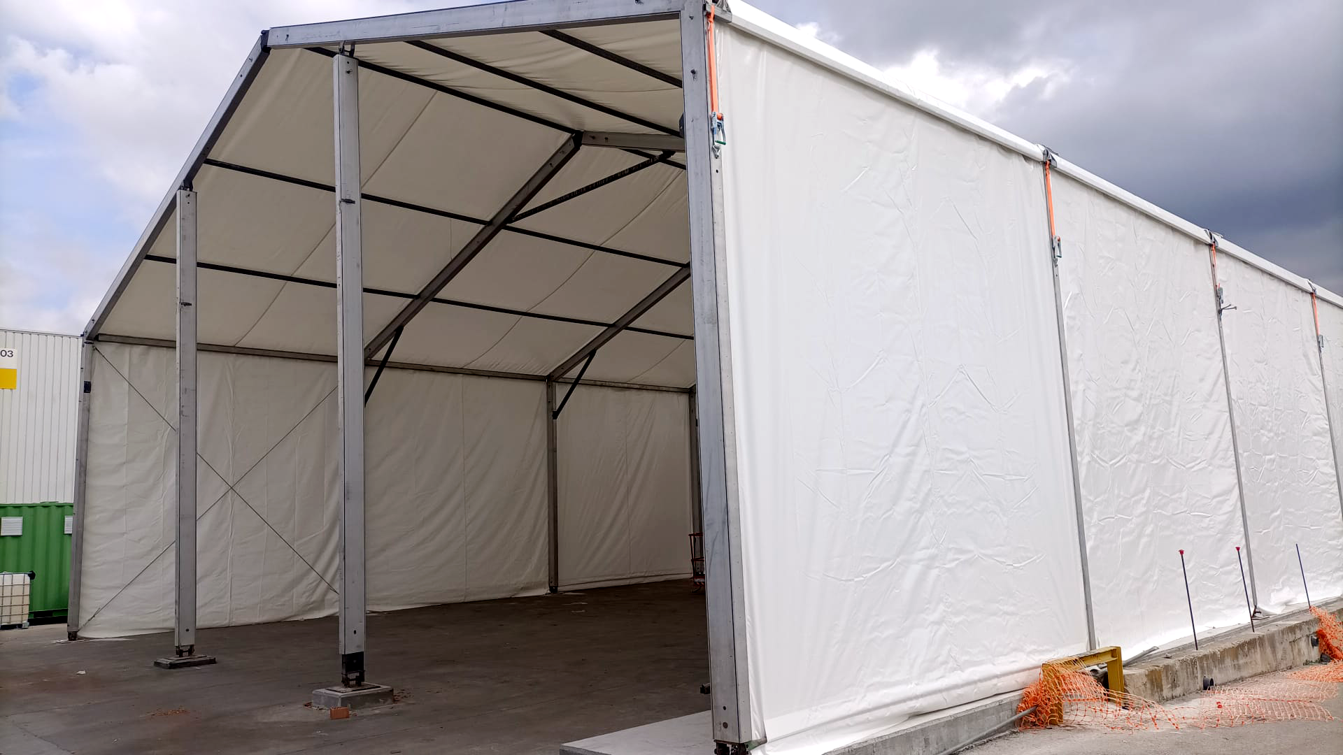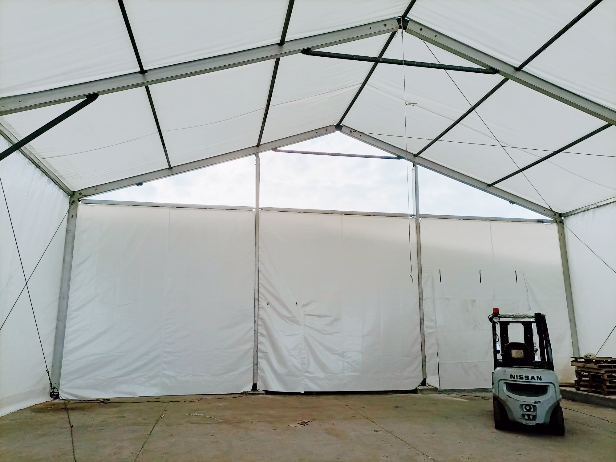 La carpa industrial instalada cuenta con una estructura de metal galvanizado reforzada y una lona de PVC impermeable para protección contra la intemperie. Su diseño permite el acceso de maquinaria y puede incluir puertas modulares. La instalación incluye preparación del terreno, montaje de la estructura, colocación de la lona y ajustes finales para garantizar estabilidad y resistencia, dejando la carpa lista para su uso inmediato.